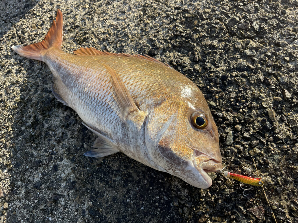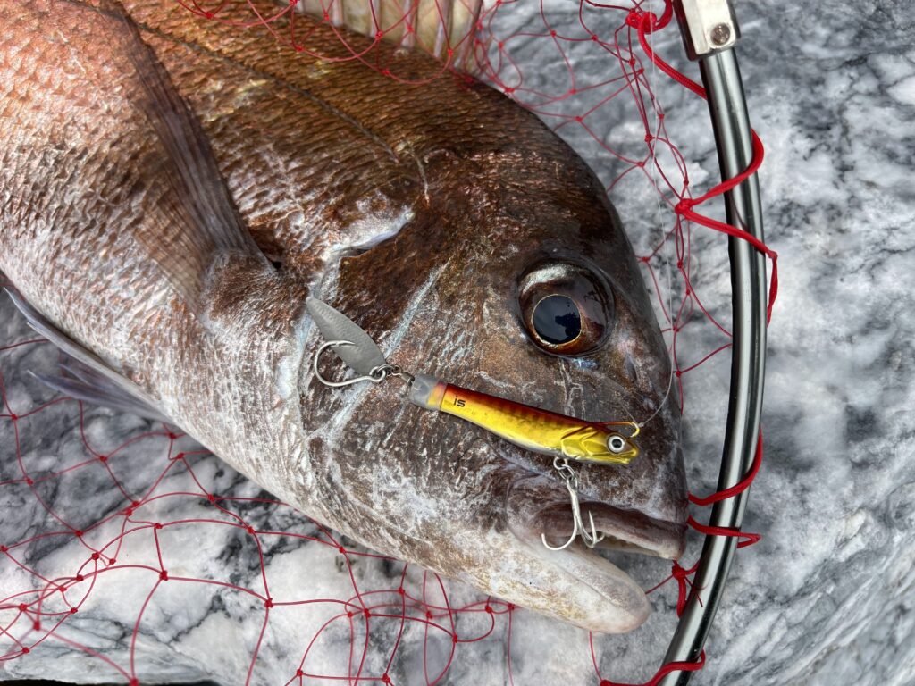 ショアキャスティングで『サカナサカナスピン』にヒットしたマダイ。ブレードが大きく回るのでフォール中も周囲へのアピールする力が強い。ショアからのマダイ攻略には定評がある