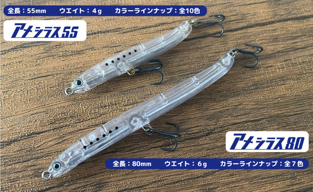 上は『アメシラス55』。全長差は25mm。ウエイト差は2g。人から見るとわずかな差ですが、釣り場では大きな違いとなります