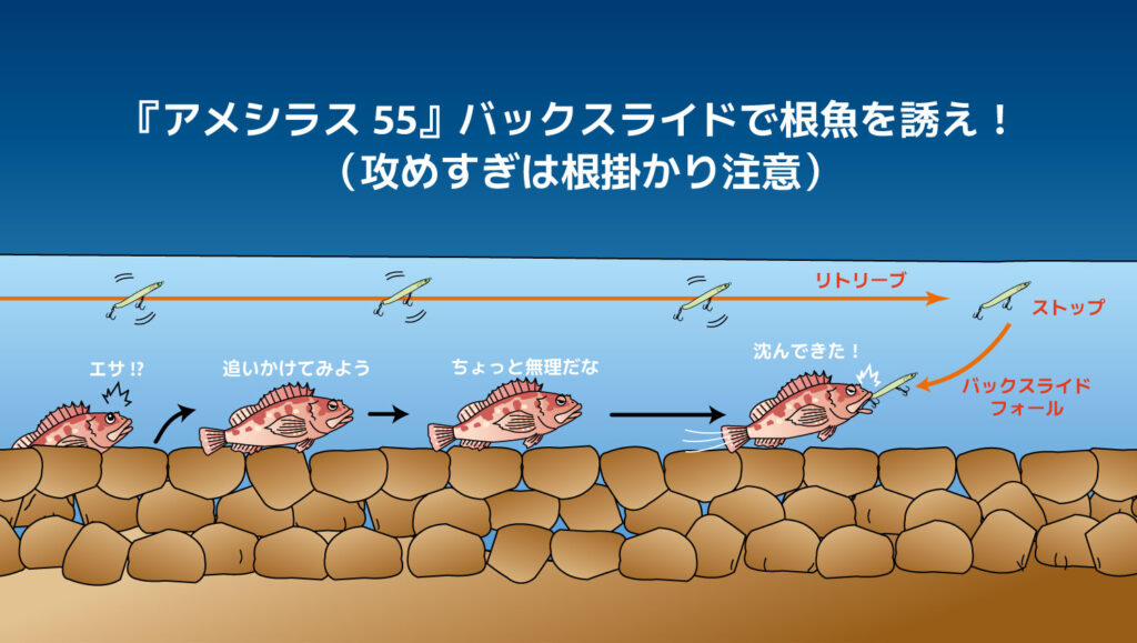 ほかにも手前へ引いて、止めてバックスライドフォールさせれば狙いたいエリアで粘っこく誘うことができます。