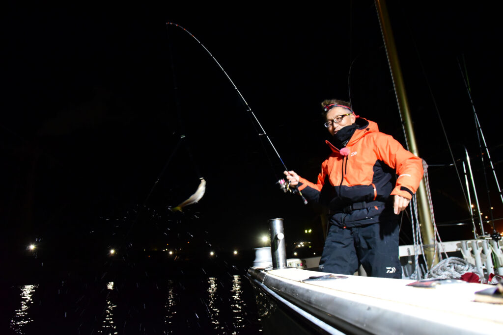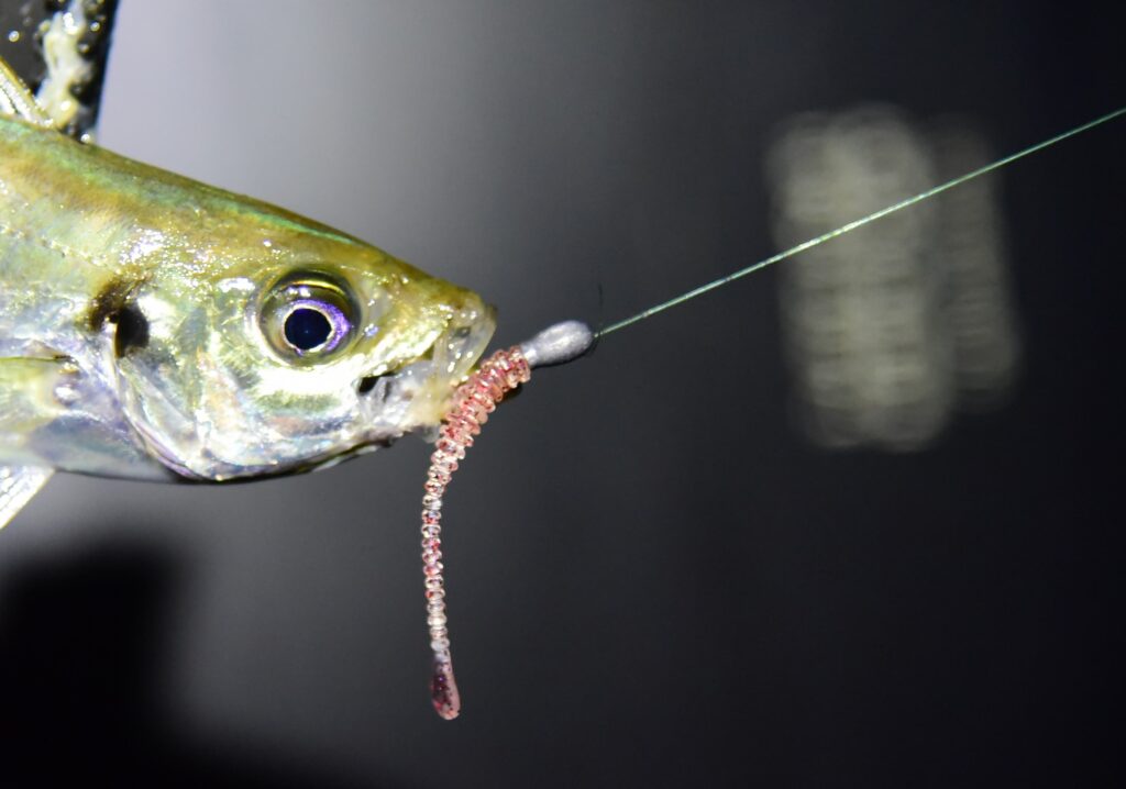 昨秋のオカッパリアジングで村上は初めて訪れた場所でこの仕掛けを使い、ボトムからシンカーを動かさず、ロッドを上下させてジグヘッドだけをアクションさせてアジを連発させました。