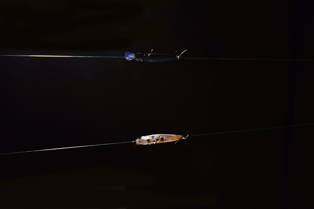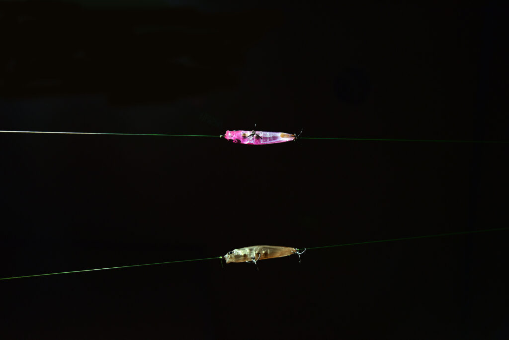 たとえば、これは『アメミノー48SR-SF』の「#003 ピンクバックテールグロー」と「#010 マットオキアミテールグロー」を暗室で上から白いライトを当てた状態です。