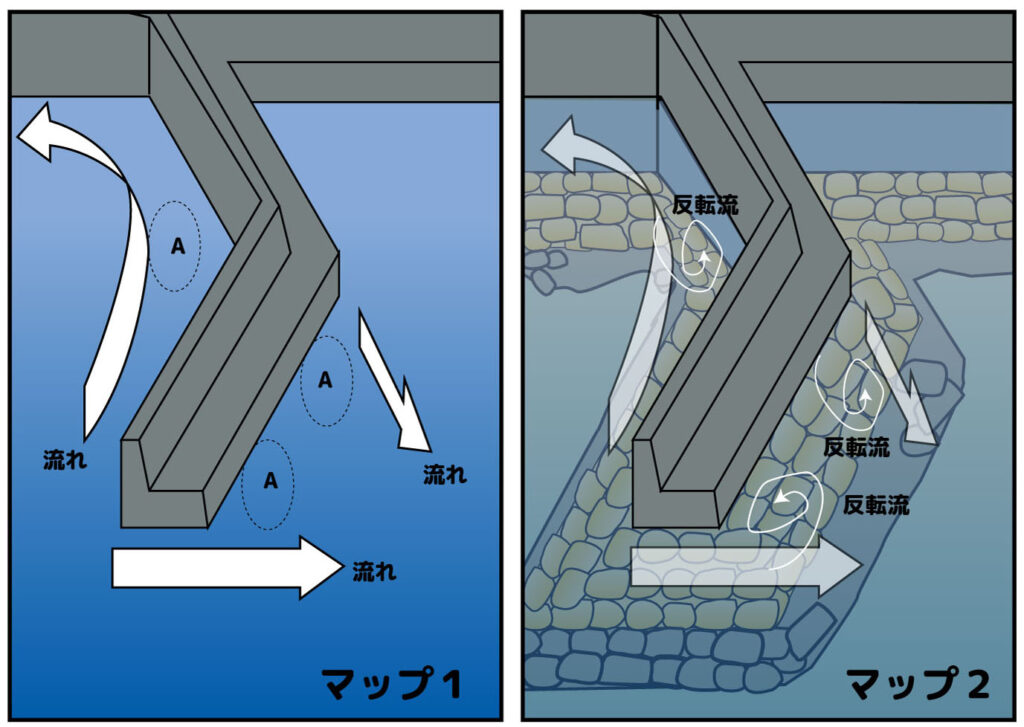 マップ1の状況でよく釣れるのが「A」の場合、そこに反転流が生まれている可能性が高いです。