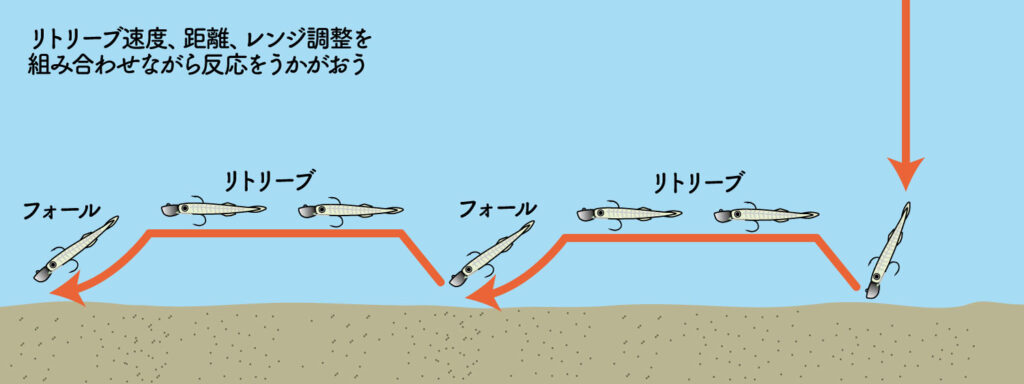 ルアーをキャストしてボトムに届いたらボトムから少し上(50cm程度までをイメージ)のレンジをリトリーブさせ、適度なところでフォールさせます。