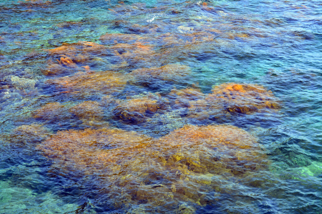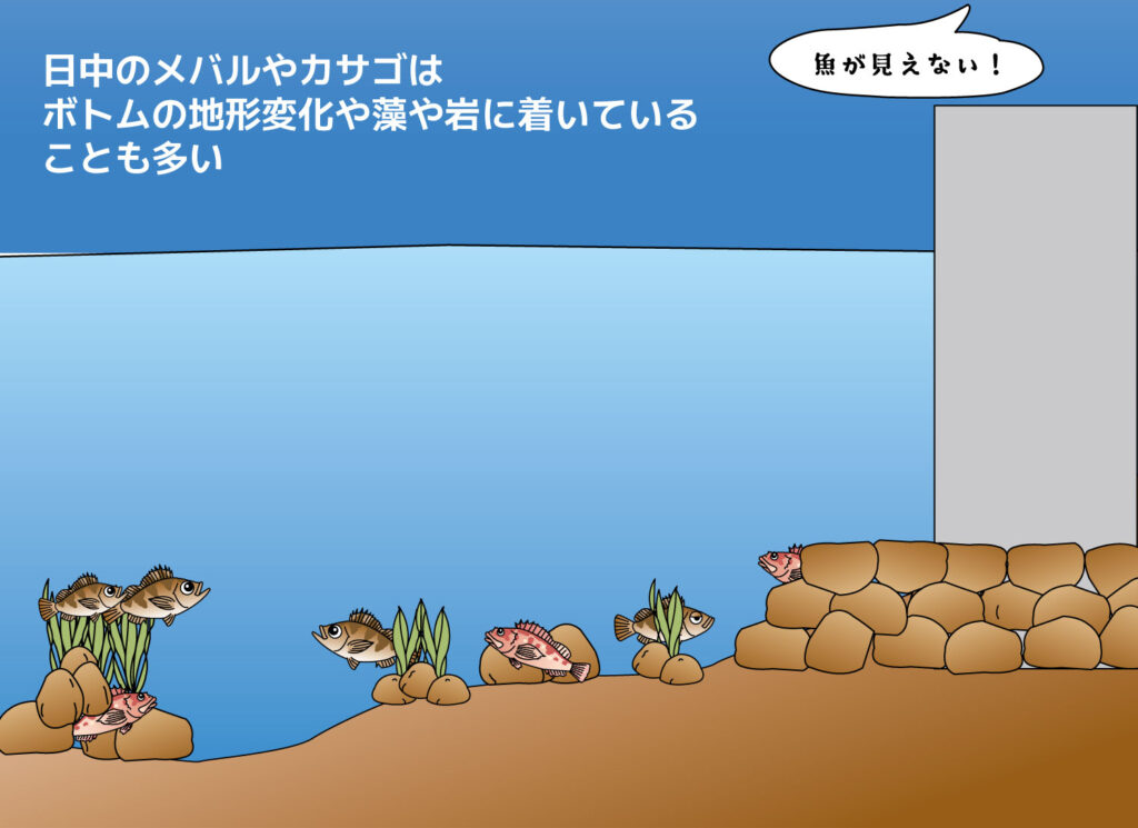 水面付近、浅場の藻場や沈み岩に魚が見えなくとも、海底には地形変化や藻、沈んだ岩があり、そこにメバルが着いていることがあります。