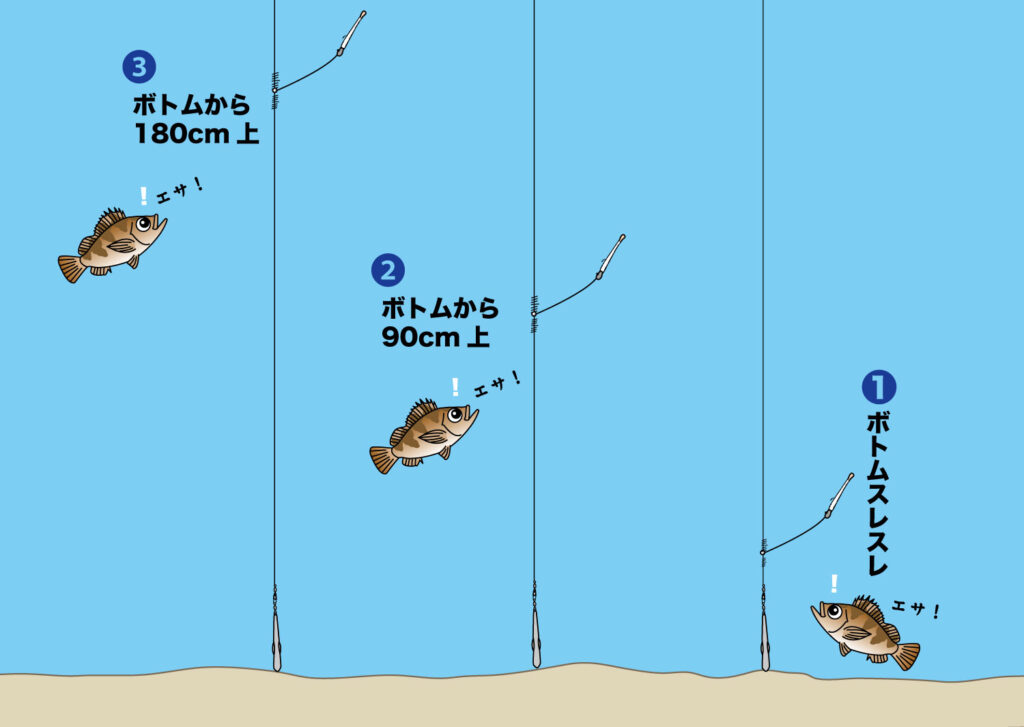 オモリの近くに移動させればボトム付近が狙え、リーダーとの結束部近くに移動させればボトムから約180cm上のレンジを的確に狙うことができます。