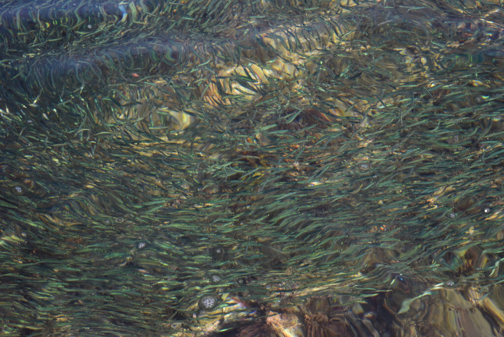 磯の岸際に押し寄せられた大量のキビナゴ。こんな状況だとオオモンハタもかなり浮いてきます
