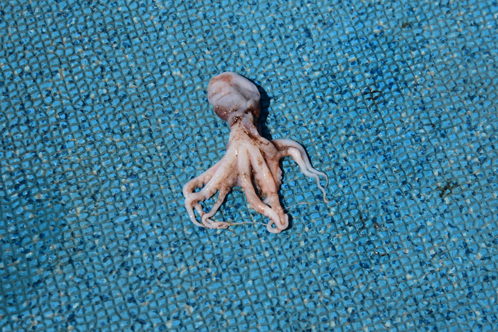 アカハタが吐き出したタコ。ボトム付近にいる生物のほとんどがアカハタのエサになっています