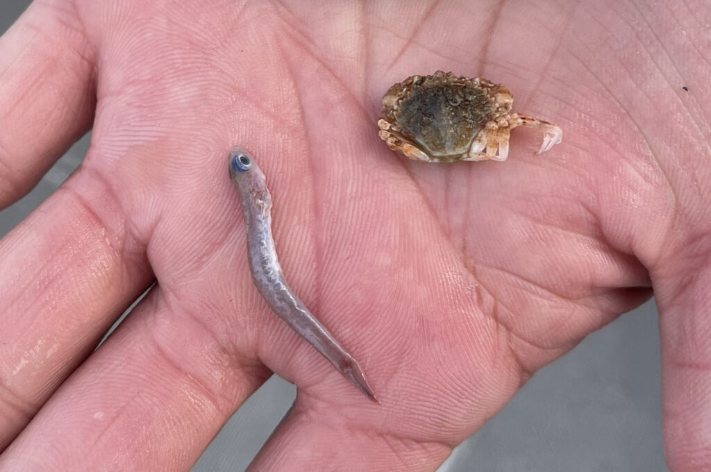 釣ったアコウが吐き出したカニと小魚。近くにいて量の多い生物を捕食している